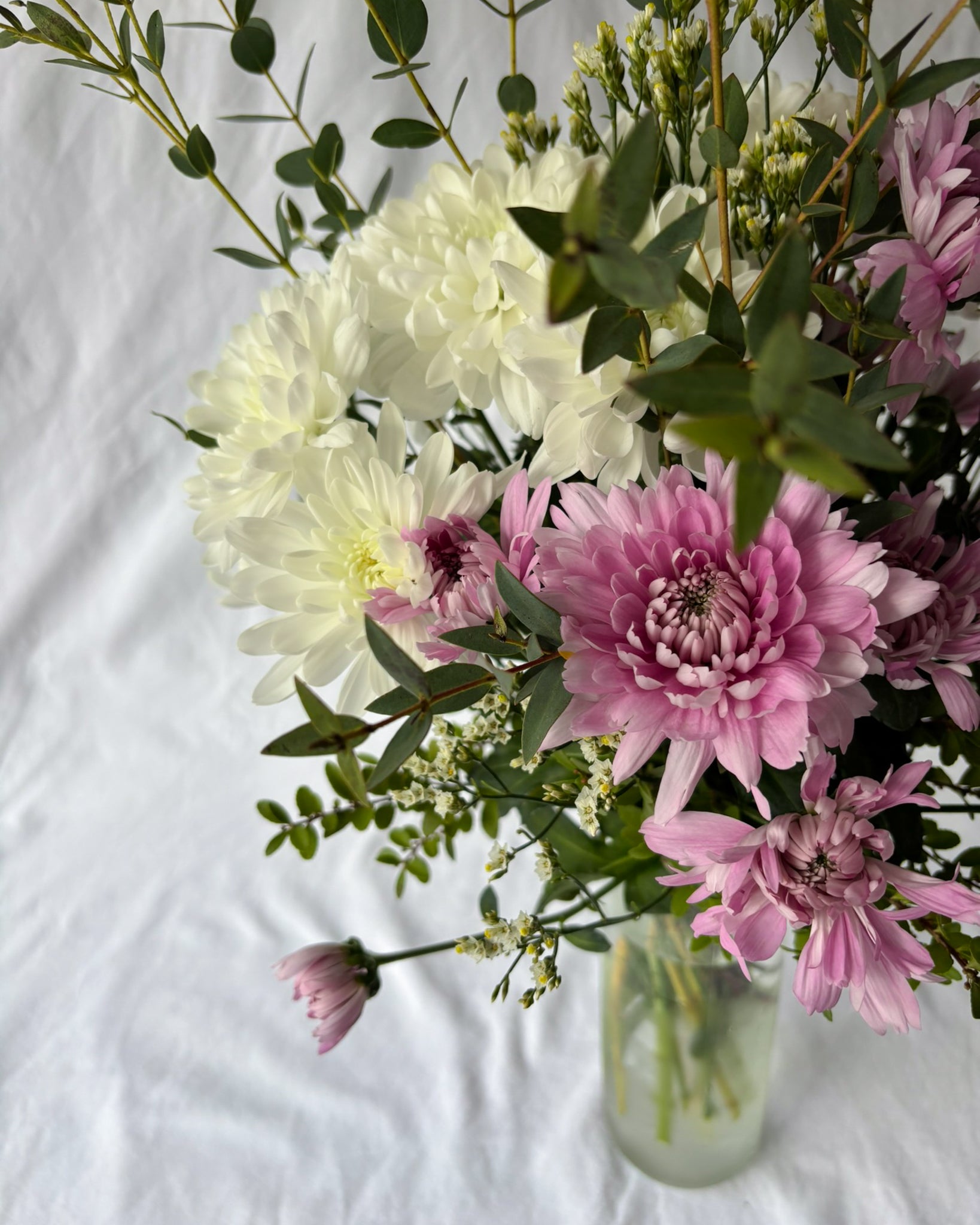 Joli bouquet de chrysanthèmes canadiens tout simple et doux. Ce bouquet délicat sera décliné en variations de fleurs blanche, rose et rouge. Pour chaque bouquet de la Saint-Valentin vendu, 2$ sont remis au Centre Philou.